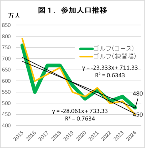 図1は直近10年間の推計ゴルフ人口の動きをまとめたものです。見てのとおりの推移です。グラフは上下しますが減少に歯止めがかかっていません。いろいろと取り組んできたはずのゴルフ振興対策の結果と判断せざるをえません。現状のままでは減少を止められない状況だと多くの関係者が思われると思います。