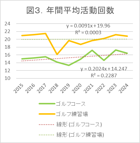ゴルフの市場規模を決定する要因の一つが利用回数です。図3はレジャー白書のデータですが、ゴルフコースは、回数の増加が見られます。ただ練習場の利用回数はほぼ変化なしといってよい状況です。人口でも触れましたが、練習場での利用状況はマーケットの低迷感が感じられます。練習場業界の積極的な対策が求められます。